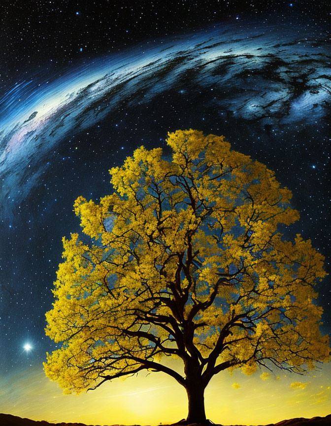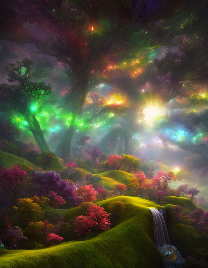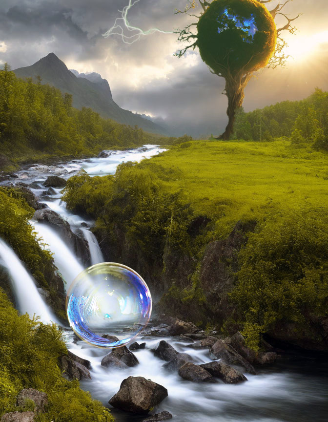 Во-первых, река, даже не река, а небольшой, но стремительный поток, был красив и сам по себе, но вот за ним раскинулась довольно большая лужайка, которую обрамляли невысокие деревья и кусты. Вдали виднелись пасмурные горы, но не это главное: чуть подальше, прямо за этой поляной возвышалось огромное дерево, всем деревьям дерево! Изредка из него вырывалась небольшая молния и стегала тучу, которая по неосторожности оказывалась рядом. Внутри самой кроны… на месте кроны был огромный зелёный шар, сквозь который выглядывало что-то ярко голубое.