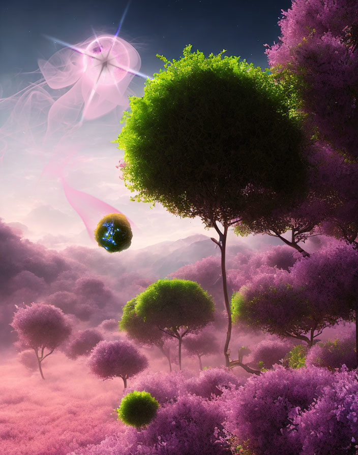 Я оглянулся по сторонам. Мы были в каком-то невысоком лесу странного цвета. Я и названия-то ему не мог подобрать – не розовый, не сиреневый – о, подобрал всё-таки: розовый с сиреневым оттенком. Среди таких деревьев изредка попадались и знакомые глазу зелёные. Правда все эти кроны были не на могучих стволах, как у нас, а на каких-то тоненьких стебельках, которые если и годились на что-то, так это на удочку.